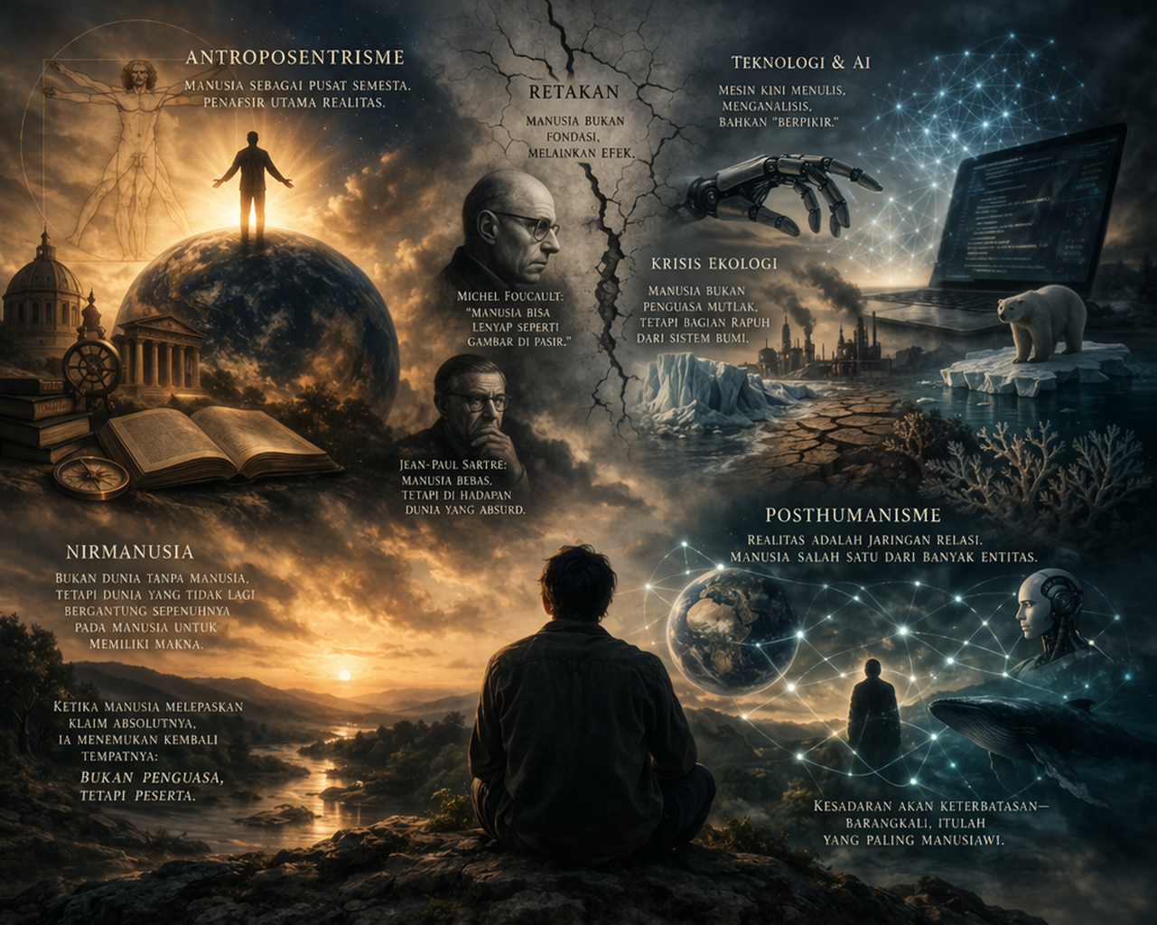 [Sumber gambar: AI] Penulis: Heri Isnaini Sejak lama, manusia menempatkan dirinya sebagai pusat semesta. Dalam kosmologi klasik hingga modern awal, manusia bukan sekadar penghuni dunia, melainkan penafsir utama realitas. Segala sesuatu (alam, waktu, bahkan Tuhan) ditafsirkan melalui kesadaran manusia. Cara pandang ini dikenal sebagai antroposentrisme, yakni keyakinan bahwa manusia adalah ukuran segala sesuatu. Namun, dalam […]