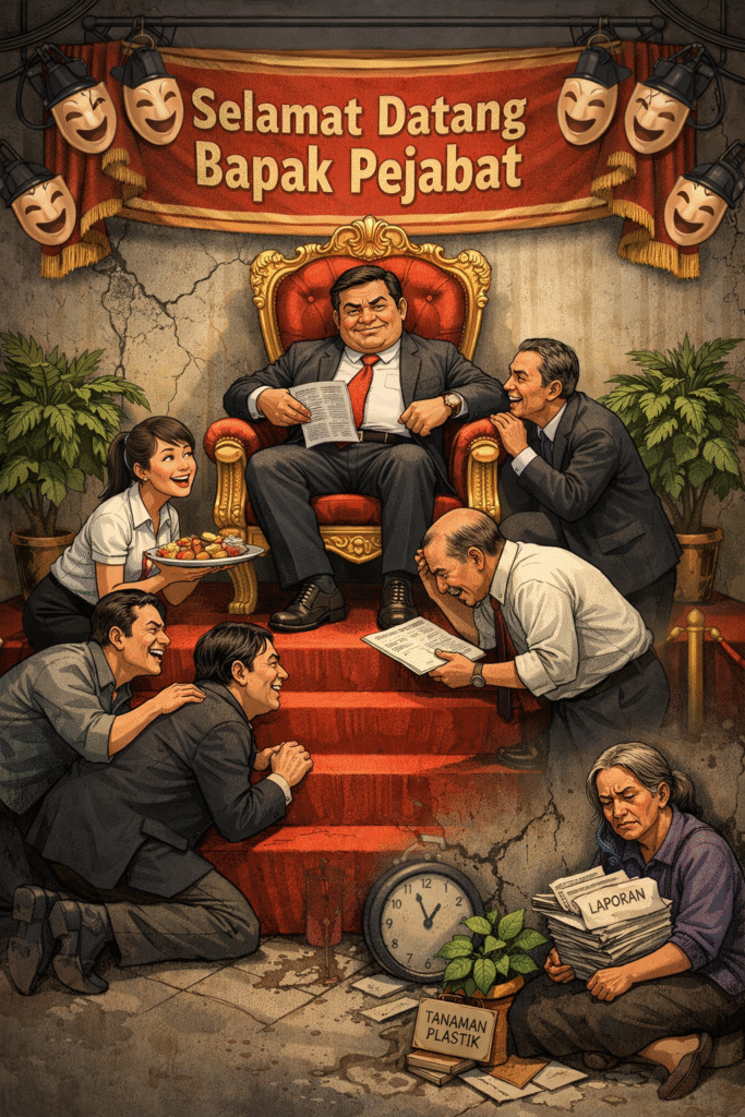 Pagi itu kantor berubah seperti panggung sandiwara yang terlalu kentara dipoles. Karpet yang biasanya kusam mendadak merah menyala, entah dari mana datangnya. Dinding yang retak ditutup kain dekorasi. Bahkan tanaman plastik di sudut ruangan yang selama ini berdebu, kini disemprot air agar tampak “hidup.”