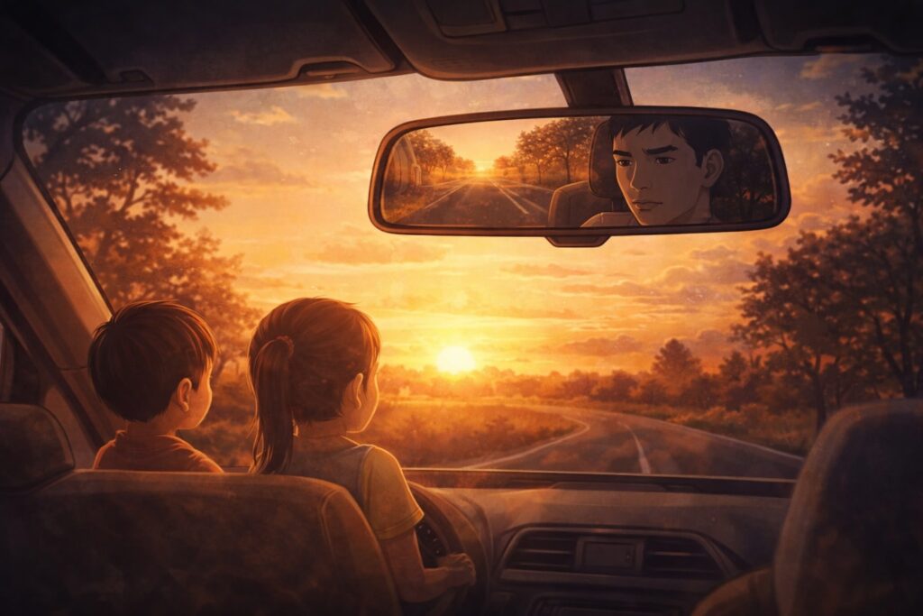 dalam tawa anak-anak di kursi belakang,